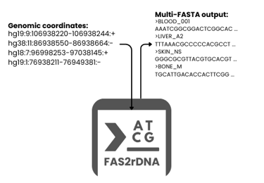FAS2rDNA is a publicly-available tool for automated, strand-aware reconstruction of DNA sequences from genomic coordinates across multiple reference assemblies, supporting multi-species processing. It is designed for batch, multi-region, and mega-scale workflows in genomics, bioinformatics, and machine learning-driven sequence analysis.