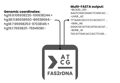 FAS2rDNA simplifies the extraction and reconstruction of DNA sequences by transforming tabulated user data inputs into reconstructed multi-FASTA outputs. Given genomic coordinates, FAS2rDNA automatically retrieves reference genomes and reconstructs the corresponding DNA sequences in a reproducible and deterministic manner. The tool is optimized for large datasets where manual sequence extraction or ad hoc scripting becomes inefficient, error-prone, or non-reproducible.